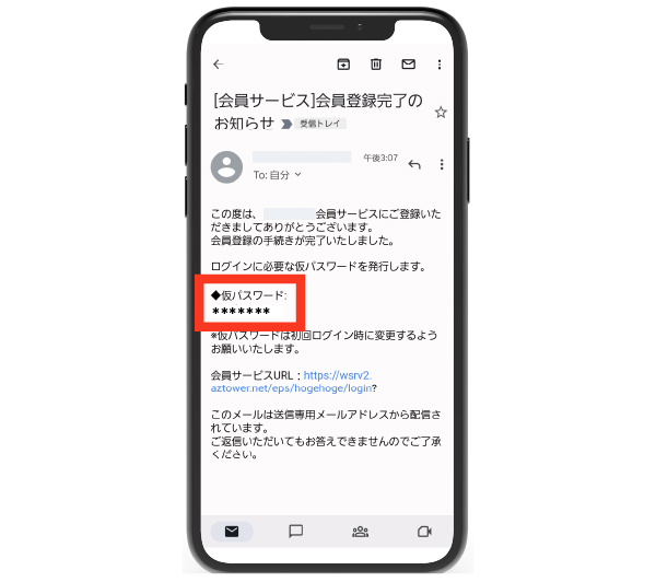 ・メール本文に記載の仮パスワードはログインの際に必要となります。